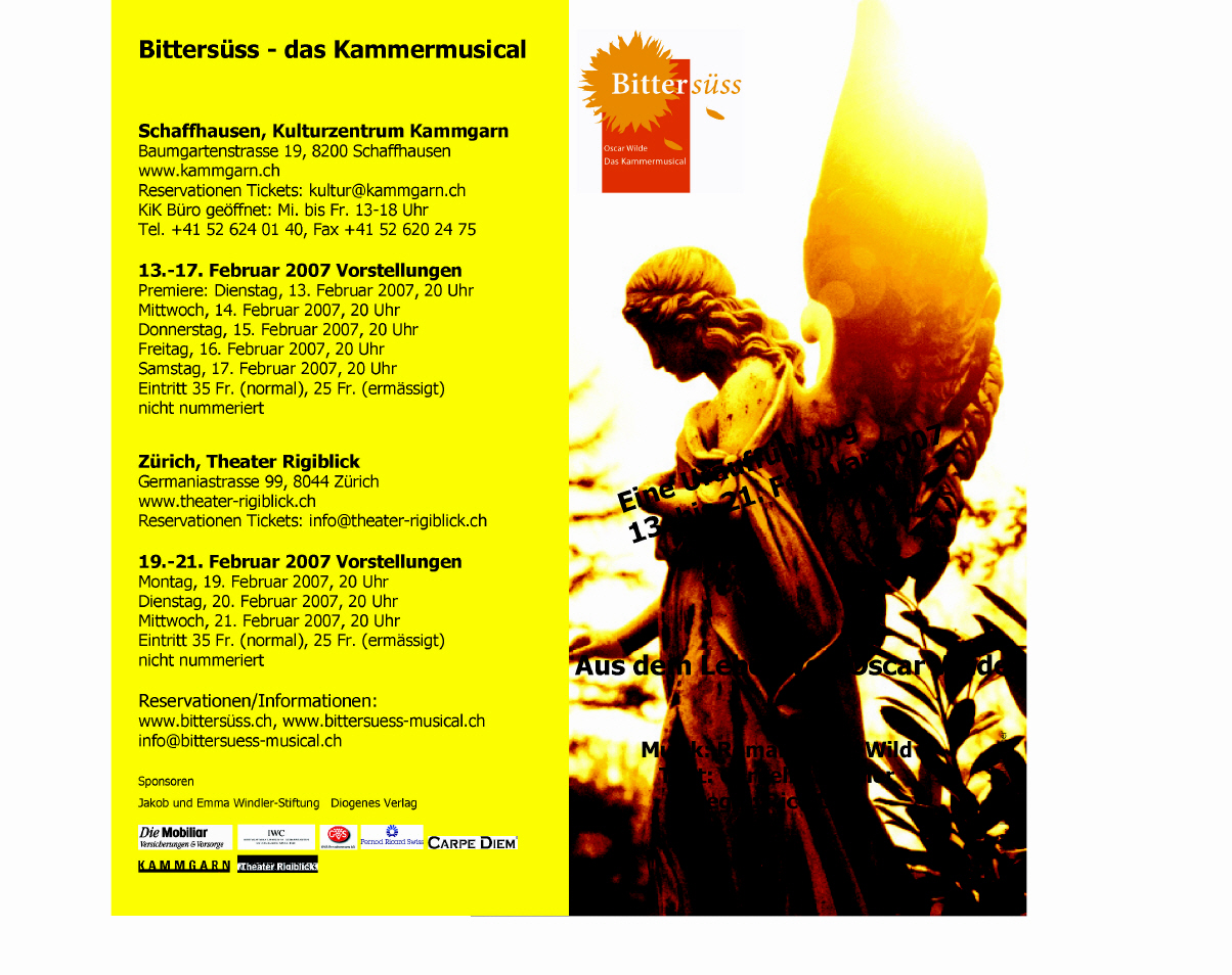 Hier können Sie die Broschüre oder unser Poster zum Musical "Bittersüss" herunterladen. Broschüre PDF-Datei [151 KB] JPG-Datei 1 / 2 Poster PDF-Datei [130 KB] JPEG-Datei